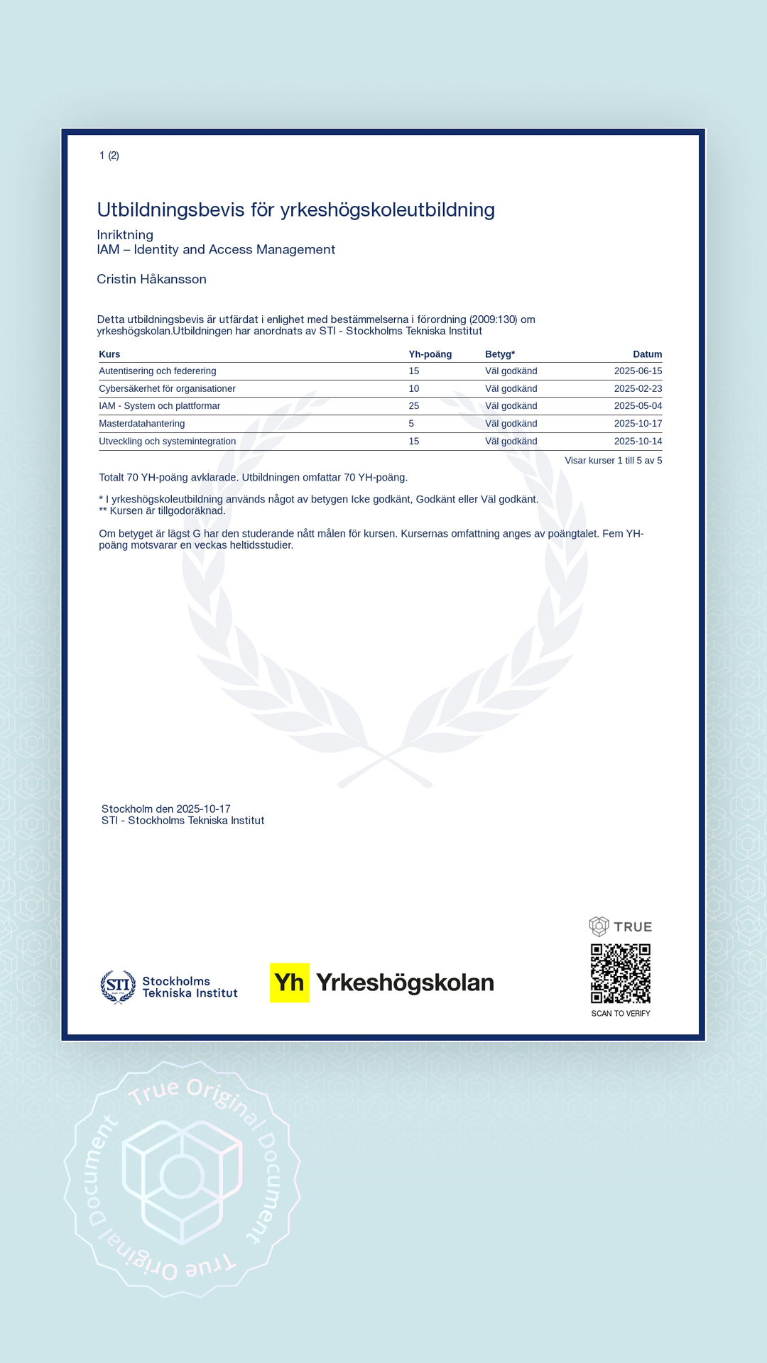 Examensbeviset är säkrat med blockchain-teknik av TRUE, vilket möjliggör verifiering både i digital form och när beviset är utskrivet.